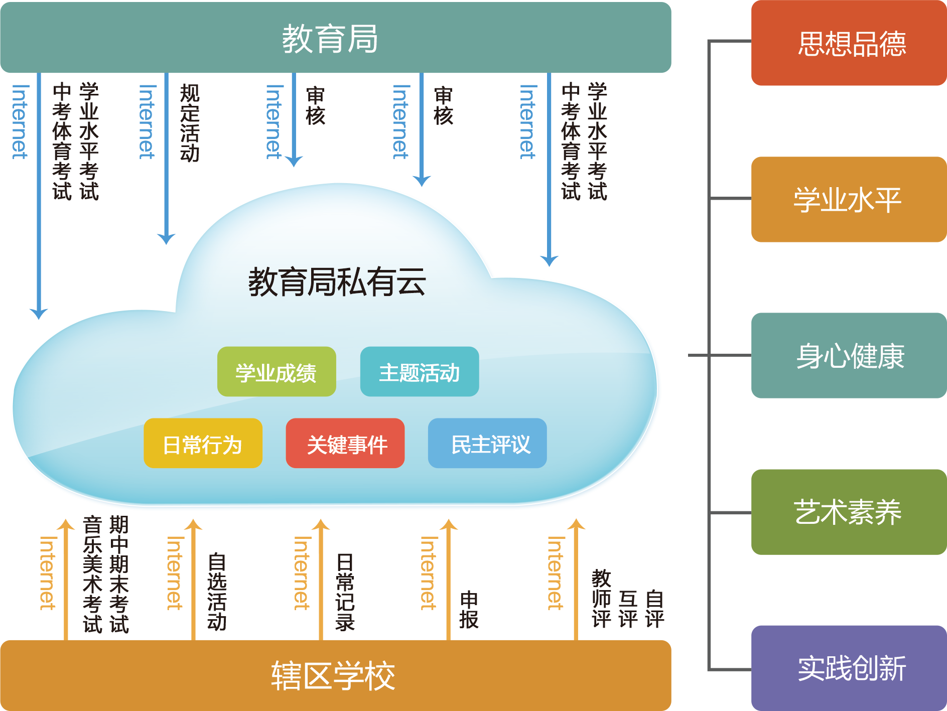从学业成绩、主题活动、日常行为、关键事件、民主评议五个方面,全方位、多维度的记录学生学习生活的成长轨迹。